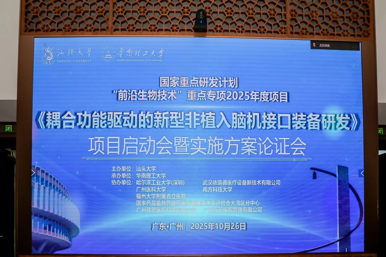 10月26日,由汕頭大學(xué)牽頭,華南理工大學(xué)、哈爾濱工業(yè)大學(xué)(深圳)、南方科技大學(xué)、廣州醫(yī)科大學(xué)、武漢依瑞德醫(yī)療設(shè)備新技術(shù)有限公司等10家單位參與的國(guó)家重點(diǎn)研發(fā)計(jì)劃“耦合功能驅(qū)動(dòng)的新型非植入腦機(jī)接口裝備研發(fā)”項(xiàng)目啟動(dòng)會(huì)暨實(shí)施方案論證會(huì)在華南理工大學(xué)廣州國(guó)際校區(qū)順利召開(kāi),標(biāo)志著這個(gè)為期三年的國(guó)家級(jí)腦機(jī)接口項(xiàng)目正式啟動(dòng)。