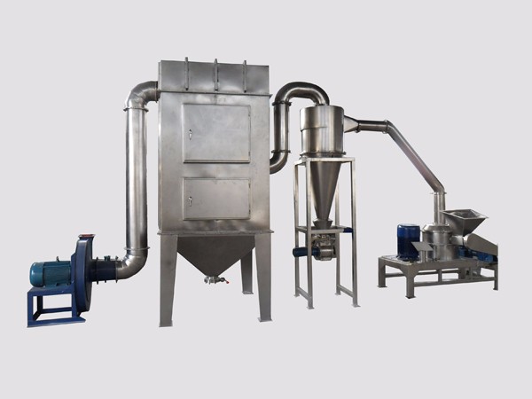 物料由料斗經螺旋輸送器進入粉碎室,被高速旋轉的刀片剪切粉碎,通過負壓風運的方法把物科運入旋風分離器、袋式除塵器,排出物料達到產品的要求。